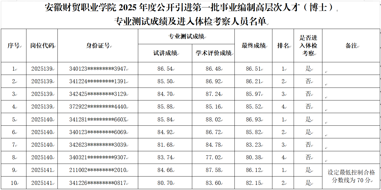 根据《安徽财贸职业学院2025年度公开引进事业编制高层次人才(博士)公告》要求,经组织报名、资格审查、专家组评审考核等,现将安徽财贸职业学院2025年度公开引进第一批事业编制高层次人才(博士)专业测试成绩及进入体检考察人员名单予以公布。